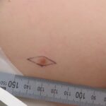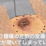 石灰化上皮腫は石の塊なので、小さい穴で取り出すことは少し難しくなります。時には小さく穴を開け、石を小さく砕きながら摘出する場合もありますが、皮下に腫瘍が撒き散らされ、すべて取れないこともあります。そのため、その腫瘍が取り出せる範囲の切開を行い手術を行いました。