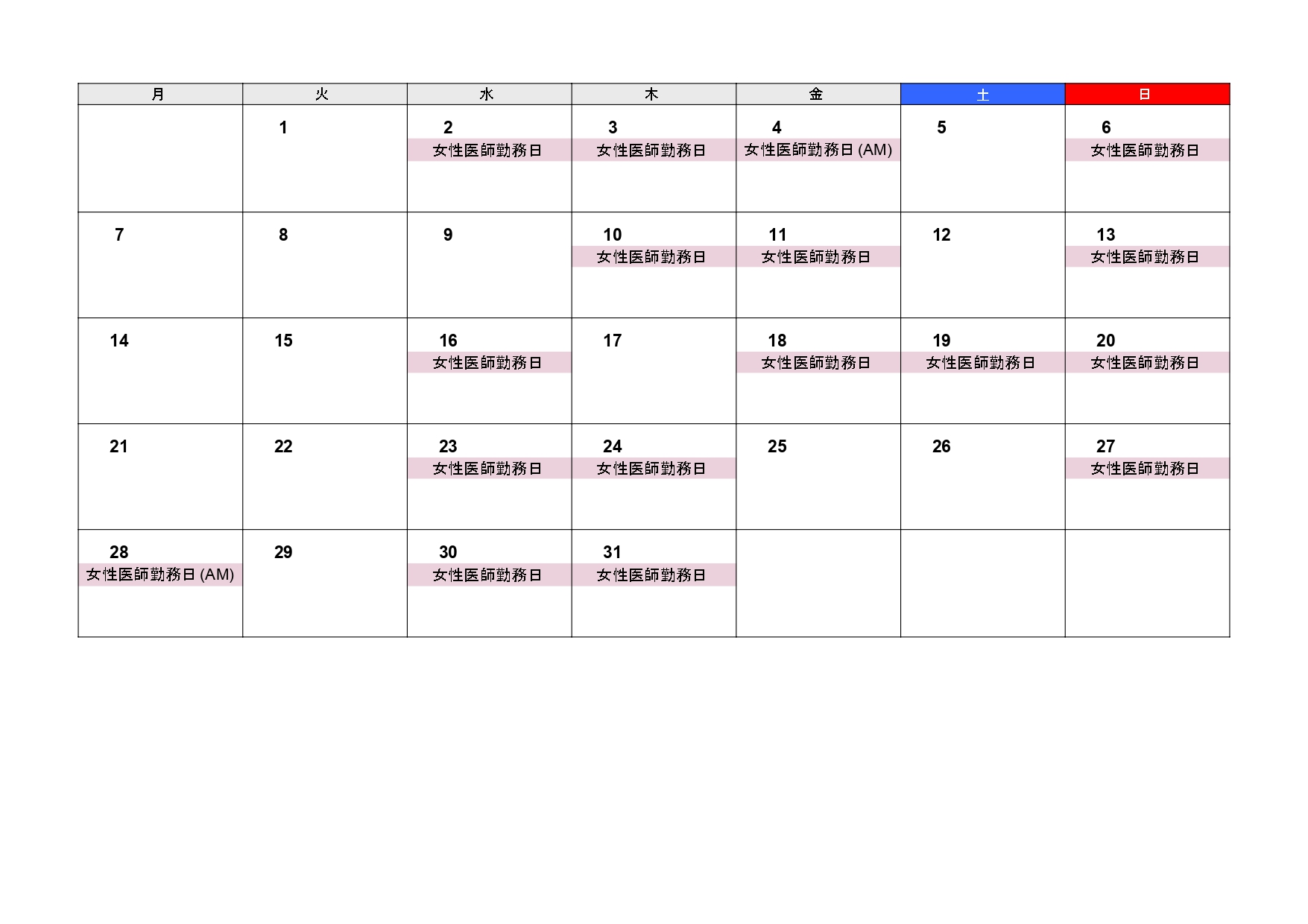 女性医師勤務日